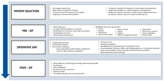 Non-modifiable conditions—for example, renal insufficiency—which may limit NSAID use in the ERAS protocol should be factored in to avoid complications. Drugs prescribed to treat pre-existing conditions should be continued before the surgery. Discontinuation and resumption of these drugs should be determined by a person with specialized knowledge of these conditions. Patients should be advised not to receive intra-articular injections in the 3–6 months leading to surgery [8,17,18].