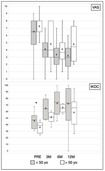 | IKDC Mean (SD) | PRE | 46.76 (11.59) | 36.28 (8.31) | 0.03 |