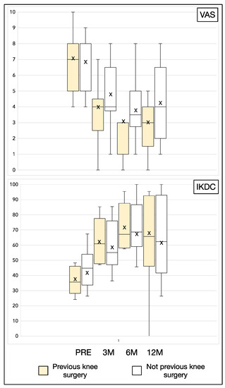 | Variable | Follow up | Previous Knee Surgery (N = 10) | Not Previous Knee Surgery (N = 15) | p |