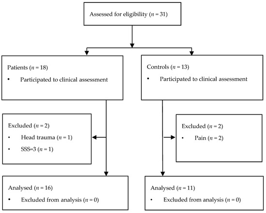 Overview of the selection procedure for participants in the study. In total, 31 participants were screened (18 patients and 13 controls). Two patients were secondarily excluded from the analysis because they finally presented one exclusion criterion each (head traumatism and one of the FM diagnosing score below defined limit). The two excluded controls complained of pain when they were interviewed.