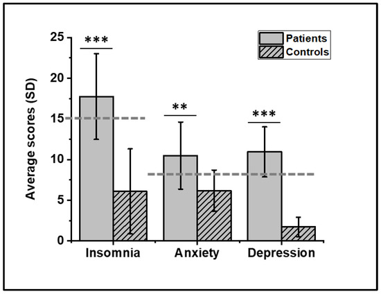 Patients suffered from moderate insomnia (68.75% with ISI ≥ 15) [40] and were moderately anxious (62% with HADanx ≥ 8) and depressed (87.5% with HADdep ≥ 8), while controls displayed neither insomnia nor mood disorders (Figure 2).
