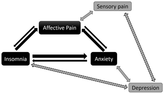 Nevertheless, pain increases/induces anxiety, which in turn, worsens pain perception [19]. In addition, pain is known to negatively affect sleep, inducing insomnia among other sleep dysfunctions [63]. These observations maintain the bidirectional relationship, despite the preferential direction mentioned above (Figure 3). Overall, they illustrate how, in FM, restoring one component of the abovementioned pain–insomnia–anxiety loop could, through a sort of virtuous circle, allow improvement of the other components.