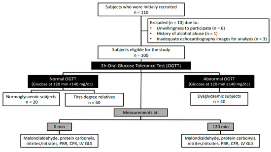 The primary outcome was the differences in baseline oxidative stress markers, nitrite/nitrate plasma levels, endothelial glycocalyx integrity, coronary microcirculation and LV myocardial strain between FDR, dysglycaemic and normoglycaemic subjects. Secondary outcomes were acute changes in oxidative stress markers and nitrite/nitrate plasma levels in relation to the corresponding changes in vascular and cardiac indexes after postprandial hyperglycaemia provoked during a 2 h OGTT in the three study groups.