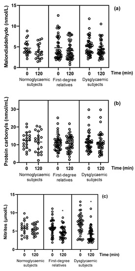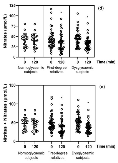 After the oral glucose loading, there were no significant changes in malondialdehyde or protein carbonyls in the three study groups (p > 0.05; Table 2; Figure 2). In FDRs and dysglycaemic subjects, nitrites, nitrates and their sum (nitrites + nitrates) were significantly decreased at 120 min, whereas they were remained unchanged in normoglycaemic subjects (−6% vs. −23% vs. −37%, p = 0.004, −3% vs. −24% vs. −29%, p = 0.002 and −3% vs. −24% vs. −30%, p < 0.001, respectively; Table 2; Figure 2).