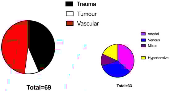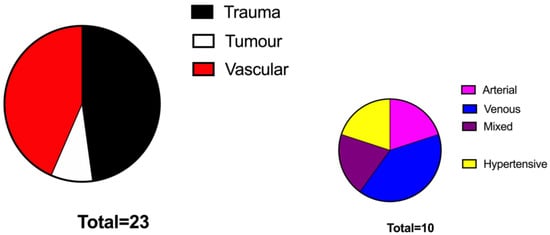 Patients’ data and wound characteristics are presented in Table 1. Patients of the VAC group were significantly older compared to those of the No VAC group (74 y.o. vs. 61 y.o., p < 0.05%, respectively). The two groups were superimposable in terms of BMI and comorbidities. The aetiology of the defects was represented mainly by vascular ulcers (47%) followed by traumatic ulcers (44%) and tumour-related wounds (7%) and were similarly distributed among the two study groups (Figure 1 and Figure 2). The grafted surface was significantly bigger in the VAC group (55 ± 7 cm2 vs. 24 ± 6 cm2 in the No VAC group, p < 0.001) (Figure 3).