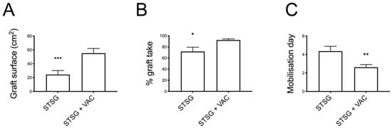 (A) Grafted surface was significantly bigger in the VAC group (55 ± 7 cm2 vs. 24 ± 6 cm2 in the No VAC group, p < 0.001, ***); (B) In terms of graft take, the No VAC group presented a graft take rate of 72% ± 8 (mean ± SEM), while in the VAC group it was 92% ± 2 (p < 0.05, *); (C) Mobilisation resulted in being significantly improved in the VAC group, with patients starting mobilisation at 2.6 ± 3 days vs. 4.4 ± 0.5 in the No VAC group (p < 0.01, **).