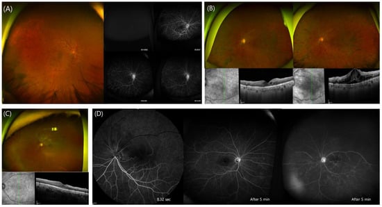 Cases 11 and 12 were of patients with a history of panuveitis accompanied by vasculitis as an underlying disease (Figure 2A,B). Patient 11 was positive for human leukocyte antigen B51 at the time of diagnosis of panuveitis, and steroid and cyclosporine were orally administered, while patient 12 was in a stable state without the need for medication. These patients were inoculated with the AZD1222 vaccine and BNT162b2 vaccine, respectively, and both visited the clinic due to reduced VA after one and three days, respectively. In both cases, greater vitreous opacity, keratic precipitates, and an increase in the number of inflammatory cells in the anterior chamber were observed. Both cases were followed up until recently (May 2022). Case #11 received three intravitreal triamcinolone injections for macular edema and phacoemulsification for the cataract. PO cyclosporin and methotrexate were maintained. The patient showed well-controlled inflammation with a final visual acuity of 20/40. Case #12 received retrobulbar triamcinolone injections twice for macular edema. Moreover, PO methotrexate was added to control inflammation. Her final visual acuity was 20/60. Case 13 was of a 55-year-old woman, who had hypertension and a history of branch RVO (in 2019) without other ophthalmic complications. The woman presented with anterior uveitis showing keratic precipitate and inflammatory cells in the anterior chamber two days after the third dose of the BNT162b2 vaccine. In FA, there were no signs of vasculitis or retinal or choroidal inflammation. The anterior uveitis was well controlled by topical steroids without recurrence. The hematologic evaluation in three patients showed no abnormal finding.