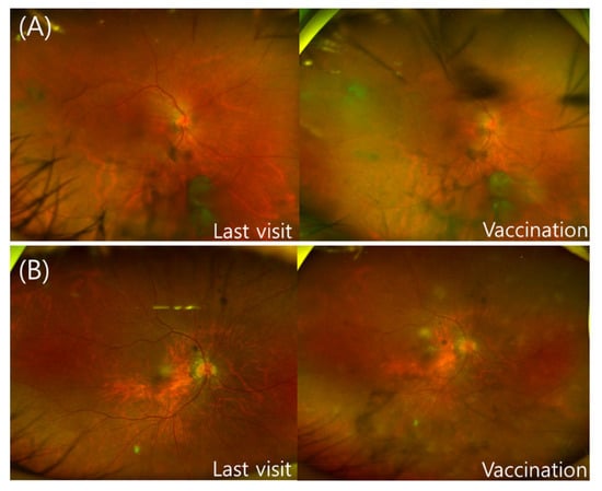 (A) (Patient 11) A 62-year-old man, previously diagnosed with panuveitis with human leukocyte antigen B51 positivity and who was taking an oral steroid and cyclosporin (Left), shows well-controlled uveitis, although vitreous opacity remains (visual acuity 20/40). (Right) The patient reported a decrease in visual acuity (VA) in the right eye one day after AZD1222 inoculation, documented as 20/100. An increase in vitreous opacity in the right eye was confirmed during fundus examination, and keratic precipitates and inflammatory cells in the anterior chamber during the slit-lamp examination were observed. (B) (Patient 12) The disease of a 79-year-old woman, who was diagnosed with panuveitis 20 years prior and undergoing follow-up, was well-controlled without topical and systemic medications (right eye VA 20/63). (Left) A relatively clear vitreous without signs of inflammation during fundus examination was observed at the last visit. (Right) The patient was inoculated with BNT162b2, and three days later, she complained of decreased VA in the right eye (20/200) and stiff pain in both eyes. During fundus examination, vitreous opacity and focal retinal infiltration were observed in her right eye.