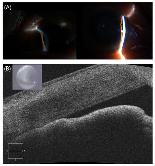 Four patients visited the clinic following AZD1222 vaccination with ocular pain and significant acute visual loss, displaying corneal microscopic cystic edema with conjunctival injection, a shallow central anterior chamber, and peripheral anterior chamber collapse nearly touching the cornea with a phakic eye (Figure 3A,B). Our four subjects’ anterior chamber depths (ACDs) were 2.19 mm, 2.19 mm, 2.89 mm, and 2.31 mm, respectively. Their axial lengths were 21.84 mm, 22.95 mm, 22.37 mm, and 23.71 mm, respectively. All four patients presented high IOP values (36, 66, 70, and 34 mmHg) and traced to one positive anterior chamber cell reaction in attacked eyes. Their spherical equivalents (SE, right eye/left eye) were −1.1/−3.63 diopters, −2.6/−3.75 D, −2.25/+1.15 D, and +0.5/+2.86 on the initial visit day after an attack, respectively. Case #16 had visited our clinic 2 weeks before the ACG attack for meibomian gland dysfunction. Hence, we were able to compare her refraction at the time of the ACG attack relative to the previous record. The SE of her right eye was −0.89 diopters at 2 weeks before the ACG attack and −2.25 diopters on the day of the ACG attack. The patient demonstrated myopic shift from her prior measurement. For IOP control, case #14 underwent phacoemulsification with goniosynechiolysis because her gonioscopic exam represented a 360° peripheral anterior synechia (PAS). Case #15 underwent trabeculectomy with Argon laser peripheral iridoplasty. The laser iridotomy did not achieve satisfactory IOL lowering effects. Case #17 had phacoemulsification with posterior chamber lens implantation. In Case #18, we decided to perform a vitrectomy with IOL scleral fixation, as his lens showed anterior shift with phacodonesis due to zonule laxity. All four cases showed generally good prognosis in terms of intraocular pressure and final visual acuity (20/20, 20/100, 20/20, and 20/25). All patients were free of corneal complications except case #15, who demonstrated a decreased corneal endothelial cell count before trabeculectomy. The patient recovered a clear cornea after surgery without edema.