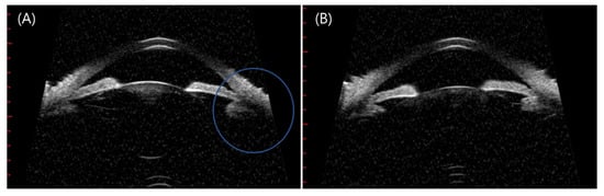 (Patient 17) (A) Right eye of a 64-year-old man, who had no previously diagnosed disease. He visited our clinic complaining of pain and redness in the right eye 6 days after AZD1222 inoculation. (B) His left eye shows a normal peripheral angle and no zonule laxity. His initial IOP was 34 mmHg associated with shallowing of the anterior chamber peripherally in the right eye. His bio-microscopy images show anterior bowing of the peripheral iris and ciliary swelling in the right eye than the left eye, which caused phacodonesis of the right eye and closure of the iridocorneal angle in the right eye. An acute attack of angle closure was diagnosed, treatment with laser peripheral iridotomy was attempted, and his IOP dropped to 10 mmHg.