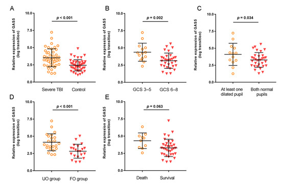 The relative levels of GAS5 in plasma samples of severe TBI patients and controls categorized by clinical variables: (A) severe TBI versus control; (B) GCS 3–5 versus GCS 6–8; (C) at least one dilated pupil versus both normal pupils; (D) unfavorable outcome (UO) group versus favorable outcome (FO) group; (E) death versus survival. Expression of GAS5 was expressed relative to its respective level of cel-miR-39. The bar represents mean and standard deviation.