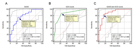 Receiver operating characteristic (ROC) curves of GAS5 (A), GCS score (B), and the combination of both (C), relative to early outcome of TBI patients.