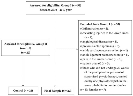 Initially, 55 patients (n = 48 men and n = 7 women) were included in the study, after surgical suturing of the Achilles tendon using an open method (SSATOM). The following inclusion criteria were applied: Unilateral surgical suturing of Achilles tendon (AT) using the open method, conducting postoperative supervised physiotherapy in patients by one physiotherapist, in accordance with one physiotherapy protocol, absence of concomitant lesions of the lower limbs, spine and concomitant diseases, and individuals between 20 and 60 years of age. Physiotherapy was carried out in the same rehabilitation center, using the same devices and experimental apparatus. On the basis of history and medical records, some patients were excluded from the initial group due to the following reasons: Inflammation (n = 2), coexisting injuries to the lower limbs (n = 4), angiologic diseases (n = 1), previous ankle sprains (n = 3), ankle cartilage reconstruction (n = 1), and ankle ligament reconstruction (n = 1). Subsequently, patients with pain in the lumbar spine (n = 1), patients who were more than 60 years old (n = 3) and less than 20 years old (n = 0), as well as those who did not undergo 20 weeks of the postoperative protocol of supervised physiotherapy, carried out by one physiotherapist, in the same rehabilitation center (n = 10 men and n = 7 women) (Figure 1) were excluded from the study [11]. Finally, 22 men with no AT rupture or other concomitant lower limb injuries were qualified for Group II (Figure 1).