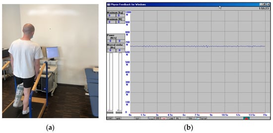 (a,b) Exercise with progressive load on the platform substrate with a lower limb operated for vGRF values, up to 1.4 bodyweight values.