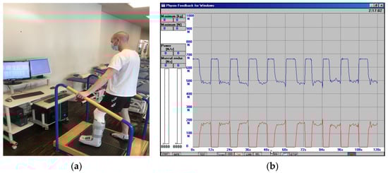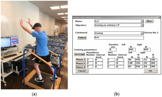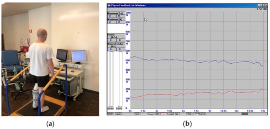 (a,b) Record of the report from one session of exercises individually selected with a value of 180 N, to which the patient could partially load the platform substrate with a limb operated for vGRF values, 3 weeks after SSATOM. This value was determined in the baseline measurement (Figure 3b) (red line—operated leg, blue line—non-injured leg).