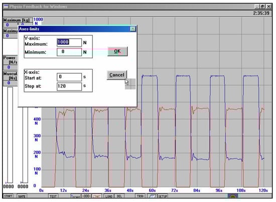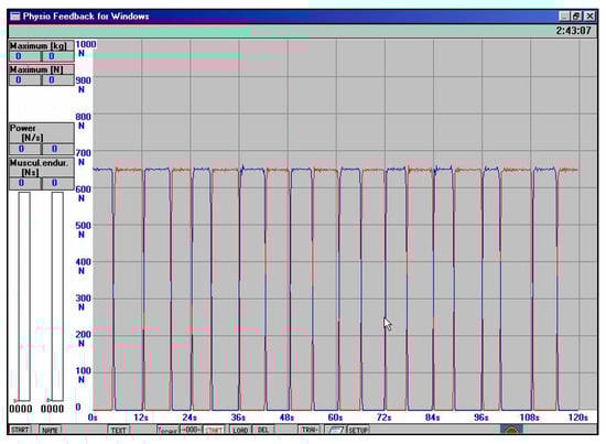 The individual result obtained by the patient for the value of the ground reaction forces (N) for the vertical component, while standing on one leg, and alternately, on the operated and non-operated lower limb. After conversion to kilograms, this corresponds approximately to the patient’s bodyweight during the exercise sessions on a strain gauge platform, within 8 weeks of physical therapy after surgical suturing of Achilles tendon, (red line—operated leg, blue line—non-injured leg).