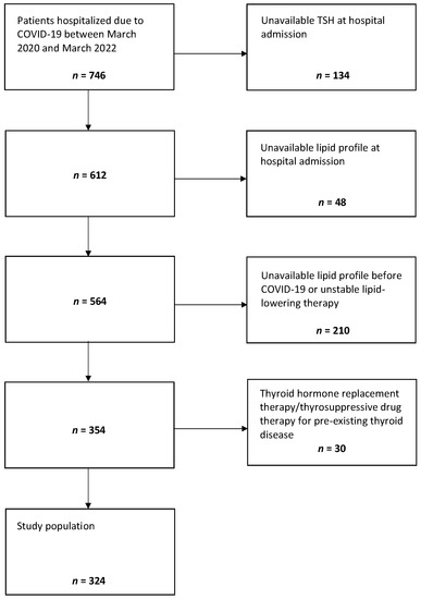 Clinical data of patients hospitalized due to COVID-19 having referred to the Internal Medicine ward of the “Santa Maria della Misericordia” Hospital of Perugia (Italy) from March 2020 to March 2022 were retrospectively analyzed. The study protocol was developed in accordance with the principles of the Helsinki Declaration and was approved by the local ethics committee. The inclusion criteria were as follows: (1) age ≥ 18 years, (2) a positive result on real-time reverse transcriptase PCR (RT-PCR) assay testing for SARS-CoV-2 on nasal or pharyngeal swab specimens at hospital admission, (3) at least one available standard lipid profile (TC, LDL-C, HDL-C, and triglycerides (TG)) from 1 month up to 1 year before COVID-19, (4) at least one available standard lipid profile and one available TSH value within 24 h since hospital admission due to COVID-19, and (5) informed written consent for medical records to be used for subsequent studies. The exclusion criteria were as follows: (1) pre-existing thyroid dysfunction/disease with ongoing thyroid hormone replacement therapy/thyrosuppressive drug therapy, and (2) pre-existing dyslipidemia with unstable lipid-lowering therapy (lipid-lowering therapy was considered unstable if it had changed over the observed time frame). According to these inclusion and exclusion criteria, clinical data of 324 patients were suitable for this retrospective analysis (Figure 1).