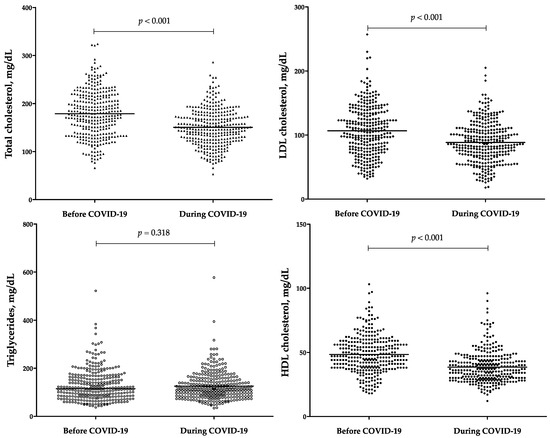 Lipid profile parameters before COVID-19 (from 1 month up to 1 year) and during COVID-19 (at hospital admission due to COVID-19). COVID-19, coronavirus disease 2019; HDL, high-density lipoprotein cholesterol; LDL, low-density lipoprotein cholesterol. Statistical significance was assessed through the paired samples t-test and the paired samples Wilcoxon test for parametric variables (i.e., total cholesterol, LDL cholesterol, HDL cholesterol) and nonparametric variables (i.e., triglycerides), respectively.