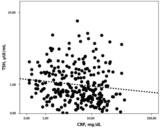 Correlation between TSH and CRP. CRP, C-reactive protein; TSH, thyroid stimulating hormone.