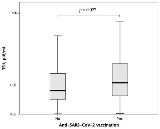 TSH levels according to anti-SARS-CoV-2 vaccination. TSH, thyroid-stimulating hormone. Statistical significance was assessed through the Mann–Whitney U-test.