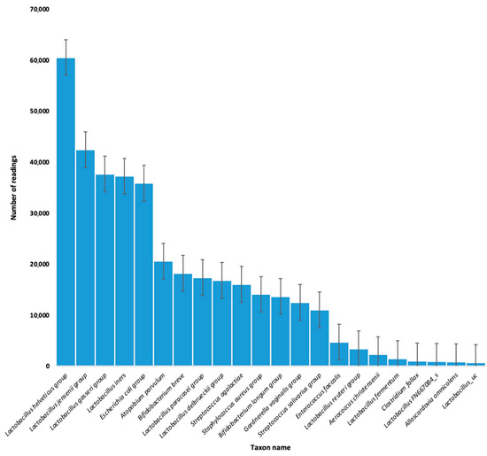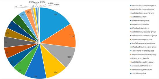 Statistically significant differences in the number of individual strains were noted between the Lactobacillus helveticus group and Aerococcus christensenii (p = 0.018682); Lactobacillus helveticus group and Bifidobacterium breve (p = 0.000569); Lactobacillus helveticus group and Enterococcus faecalis (p = 0.044475); Lactobacillus helveticus group and Gardnerella vaginalis group (p = 0.000131); Lactobacillus helveticus group and Lactobacillus fermentum (p = 0.015366); Lactobacillus helveticus group and Lactobacillus FN667084_s (p = 0.013261); Lactobacillus helveticus group and Lactobacillus gasseri group (p = 0.004716); Lactobacillus helveticus group and Lactobacillus reuteri group (p = 0.000015); Lactobacillus helveticus group and Lactobacillus paracasei group (p = 0.003550); Lactobacillus jensenii group and Lactobacillus reuteri group (p = 0.000015); Lactobacillus reuteri group and Lactobacillus gasseri group (p = 0.010148); Staphylococcus aureus group and Lactobacillus FN667084_s (p = 0.003550); and Lactobacillus jensenii group and Lactobacillus reuteri group (p = 0.010148). The exact results of the post hoc test are presented in the Supplementary Materials (Table S1).