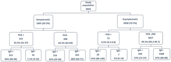 Flow diagram of 4943 HCWs included in the study after participation in the seroprevalence survey, classified according to the presence of symptoms, PCR result, and specific serology result (IgG+/IgG−). Between parentheses, 95% confidence interval of each rate.