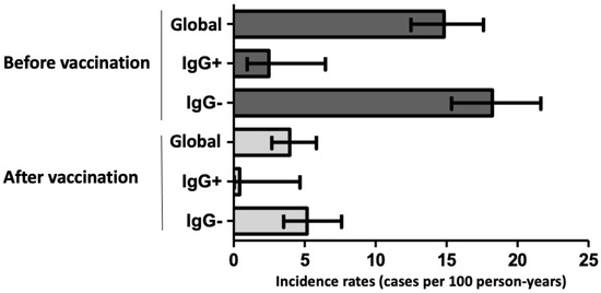 Incidence rates (95% confidence interval) of new infections/reinfections in the period before vaccination (dark grey bars) and after vaccination (grey bars), globally and according to positive (IgG+) or negative (IgG−) anti-N specific serology during the first wave of the disease.