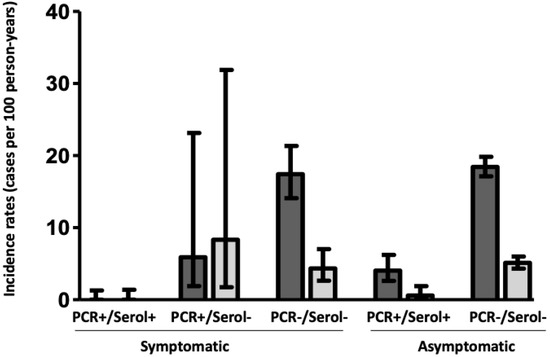 Incidence rates (95% confidence interval) of new infections/reinfections in function of the five different subgroups of the study (dark grey bars, before vaccination; grey bars, after vaccination). PCR, polymerase chain reaction; Serol, anti-N specific serology.
