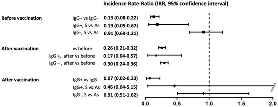 Incidence rate ratio (95% confidence interval) of new infections/reinfections according to period before or after vaccination, presence or no of specific antibodies, and classified as symptomatic or asymptomatic at the first surge of the disease. IgG, specific anti-N serology; S, symptomatic; As, asymptomatic.