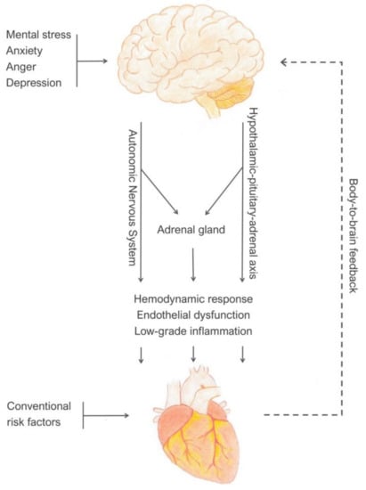 The impact of mental stress on CAD is part of a more general relationship between emotional factors and several chronic and acute illnesses, such as viral infections, autoimmune diseases, gastrointestinal disorder, obesity, diabetes, and cancer [,]. Conversely, illnesses, especially heart disease, result in negative emotion which may affect the disease progression and outcome. In addition, myocardial infarction and heart failure activate inflammatory pathways that can mediate neural changes, including neurodegeneration, which may result in long-standing cognitive dysfunction, acceleration of atherosclerosis and further triggering of CAD [,].