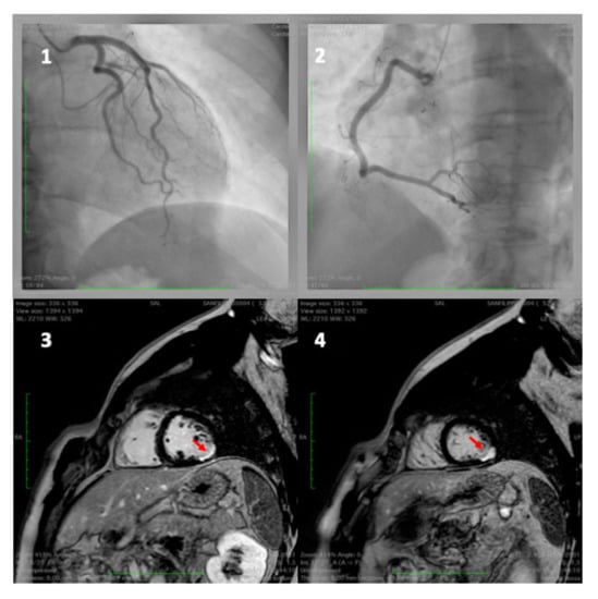 A 49-year-old man admitted for inferior ST elevation myocardial infarction. Coronary angiography showed no coronary lesions on left and right coronary artery (frames 1 and 2). The MRI, one day later, detected ischemic lesions (delayed enhancement) of sub-endocardial (frame 3) and transmural (frame 4) inferior–lateral wall.
