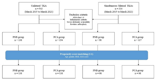 A total of 857 consecutive TKAs were performed by a single surgeon between March 2015 and March 2021. Only patients for whom all data elements were prospectively collected—including demographics, anesthesia type, and American Society of Anesthesiologists (ASA) class—were included. Patients with ASA class ≥ 4; with secondary arthritis due to rheumatoid arthritis or trauma; who needed special instrumentation due to severe instability, bone defect, or anatomical deformity; who required additional procedures other than TKA; or had a history of revision surgery were excluded. In this study, 1:1 propensity score matching was used to minimize selection bias, with matched variables being age at operation, gender, BMI, and ASA class. After matching, 138 cases with PNB were matched with 138 cases with PCA alone in the unilateral TKA group, whereas 98 cases with PNB were matched with 98 cases with PCA alone in the simultaneous bilateral TKAs group (Figure 1).