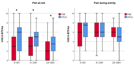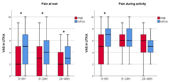 A graph showing the VAS scores of the PNB and IVPCA groups with UTKA. Horizontal lines represent medians; boxes represent 25th to 75th percentiles; whiskers represent minimums and maximums. * Significant difference between two groups was expressed. UTKA = unilateral total knee arthroplasty; PNB = peripheral nerve block; IVPCA = intravenous patient-controlled analgesia; VAS = visual analogue scale; H = hours.