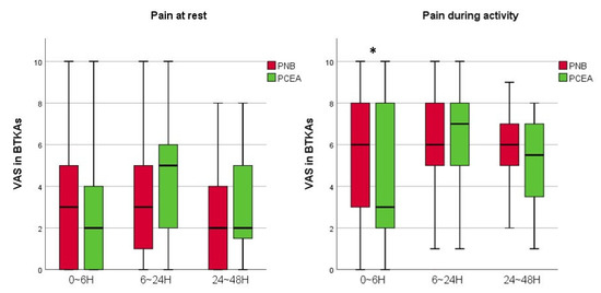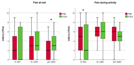 A graph showing the VAS scores of the PNB and PCEA groups with UTKA. Horizontal lines represent medians; boxes represent 25th to 75th percentiles; whiskers represent minimums and maximums. * Significant difference between two groups was expressed. UTKA = unilateral total knee arthroplasty; PNB = peripheral nerve block; PCEA = patient-controlled epidural analgesia; VAS = visual analogue scale; H = hours.