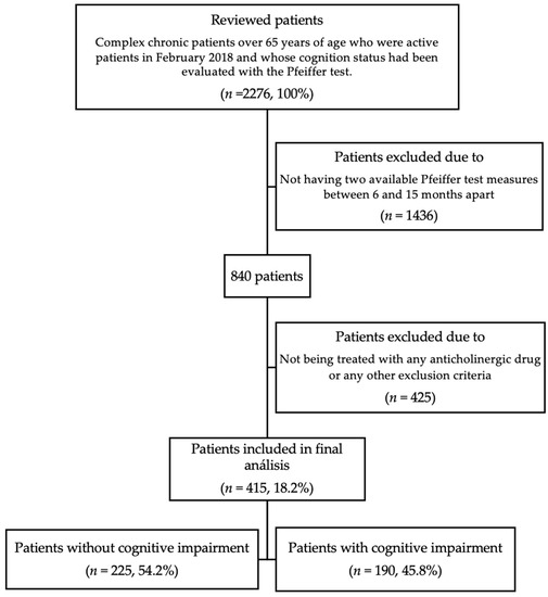 A total of 2276 patients was reviewed, of whom only 415 (18.2%) were included. The remaining patients were excluded based on the first exclusion criterion: not having two available Pfeiffer test measures between 6 and 15 months apart. Among the patients who did meet this criterion, the next exclusion point was not being treated with any anticholinergic drug. Excluded patients who passed this screening criterion were excluded because they did not pass the rest of the exclusion criteria (Figure 1).