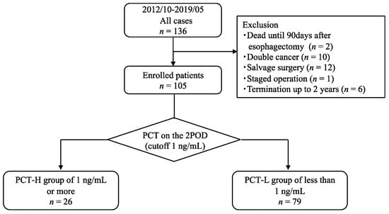 Blood samples were collected directly in the morning of postoperative day (POD) 2, 4, and 7. PCT levels were measured using the Elecsys BRAHMS PCT assay (Roche Diagnostics GmbH, Mannheim, Germany) with an upper limit of 0.05 ng/mL. The cutoff value for the diagnosis of sepsis was 0.5 ng/mL, and the cutoff value for the severity of sepsis was 2.0 ng/mL. In this study, we set the cutoff value to 1.0 ng/mL, which is the third quartile in the second POD to investigate the association between PCT level and infectious complications after esophagectomy or long-term prognosis, with >1.0 ng/mL in the PCT-High group and <1.0 in the PCT-Low group.