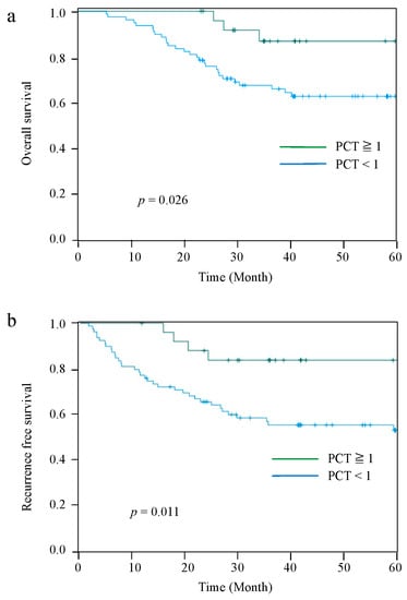The Kaplan–Meier curves for OS and RFS comparing the PCT-High and PCT-Low groups at 2 POD are shown in Figure 2. The median observation period for all cases was 42.5 (range: 5.6–84.5) months. Patients in the PCT-Low group had significantly worse OS and RFS than those in the PCT-High group (p = 0.026 and p = 0.011, respectively). The 5-year OS and RFS rates were 86.8% and 83.8%, respectively, in the PCT-High group, and 62.6% and 55.4%, respectively, in the PCT-Low group. However, there were no significant differences in OS and RFS between the PCT-two groups on 4 POD and 7 POD (Figure 3).