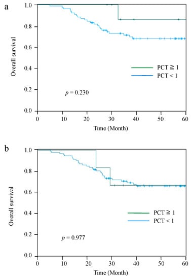There are two possible reasons that an elevation in PCT without bacterial infection improves prognosis. First, PCT secreted into the blood induces monocyte migration and enhances the phagocytic ability of bacteria and, simultaneously, PCT activates T lymphocytes and promotes biological defense []. It has been reported that the expression of T lymphocytes after esophagectomy for ESCC reduces the recurrence of esophageal cancer and improves the prognosis []. In this study, both RFS and OS were better in the PCT-High group compared with those in the PCT-Low group at 2 POD, suggesting that the expression of PCT without bacterial infection induces T lymphocytes after esophagectomy and improves the prognosis.