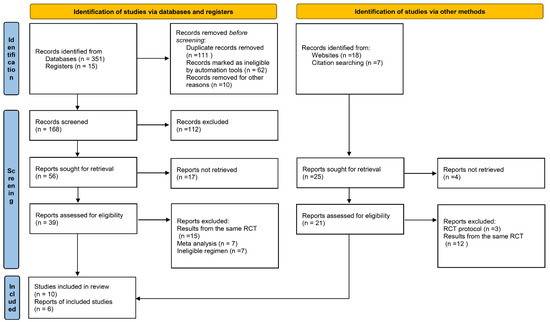 The search process used for the systematic reviews is presented in Figure 1 and was performed according to the 2020 Preferred Reporting Items for Systematic Reviews and Meta-Analyses (PRISMA) guidelines. A total of 366 studies or randomized control trials (RCTs) were imported from the PubMed, Embase, and RCT registry following the performance of automated searches. Of these studies, 111 duplications were removed, and 112 studies were excluded because their design, population, or intervention did not meet our established inclusion criteria. After title and abstract screening, 39 studies were included for full-text review. We updated data of each RCT; therefore, 15 midterm RCT reports were excluded because the updated results were published. In addition, 7 studies were excluded because anti-angiogenic agents were administered following EGFR-TKI therapy. Finally, 7 meta-analyses were removed after we reviewed the reference list for more relevant studies. After the full-text review, 10 studies were included in our analysis. We also identified 25 studies from the websites of global conferences and citations from the included RCTs. Among these, 12 duplications, 4 observed reports, and 3 protocols without results were excluded, resulting in 6 studies included. In total, 4 of them were duplicated with published studies from database, and the remaining 2 studies (BEVERLY trial and ETOP BOOSTER trial) were just presented in the conference abstract. At the end of the process, 16 published studies describing the results of 11 RCTs with 2068 patients were included in the in our meta-analysis.