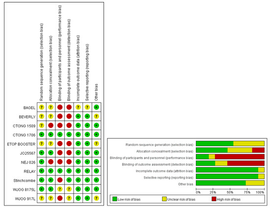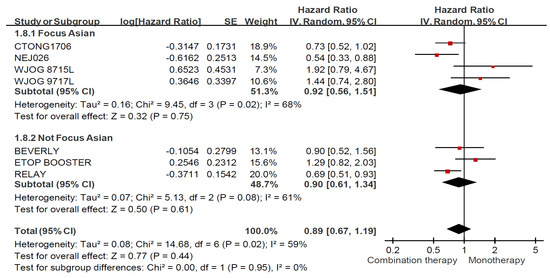 The results of the quality assessment are presented in Figure 2. The protocols for the BEVERLY, ETOP BOOSTER, and WJOG 9717L trials were not provided in the published reports [29,30,31]; therefore, we retrieved detailed information from the RCT registration website and the ESMO presentation data. Performance bias was assessed in most RCTs due to the open-label design. However, performance bias appeared to have limited influence because objective indicators, such as OS, PFS, and overall RR (ORR), were applied as our study outcomes.