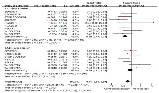 Figure 5 shows the overall effect of combination therapy using an EGFR-TKI plus an anti-angiogenic agent among never smokers, which failed to show an improved PFS compared with the use of am EGFR-TKI alone (HR: 0.89, 95% CI: 0.67–1.19). Analysis of individual EGFR-TKI–based regimens revealed that erlotinib-based combination regimens showed significantly longer PFS (HR: 0.69, 95% CI: 0.54–0.87), but gefitinib- and osimertinib-based combination regimens failed to show superior efficacy compared with either EGFR-TKI alone. The combination of osimertinib plus an anti-angiogenic agent failed to show a longer PFS for the entire enrolled population (Appendix B, HR: 1.08, 95% CI: 0.80–1.47) and for never smokers (HR: 1.41, 95% CI: 1.00–1.99), but osimertinib-based combination regimens presented significantly longer PFS among ever smokers (HR: 0.64, 95% CI: 0.42–0.99) in the meta-analysis.