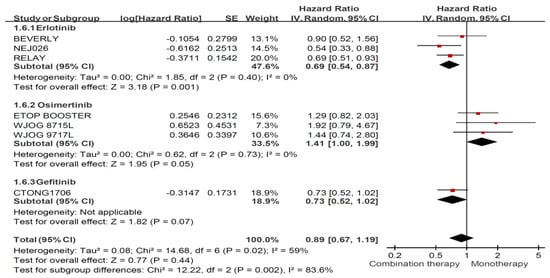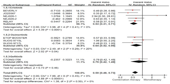 Among the different EGFR-TKIs tested, patients who received erlotinib plus an anti-angiogenic agent had significant benefits for PFS (HR: 0.60, 95% CI: 0.52–0.69) compared with erlotinib alone. However, no significant benefit was observed for OS (HR: 0.89, 95% CI: 0.76–1.05) or ORR (RR: 1.05, 95% CI: 0.98–1.13). Among patients treated with gefitinib, a superior effect was noticed for PFS in response to combination therapy compared with TKI monotherapy (HR: 0.71, 95% CI: 0.54–0.93) but not for OS (HR: 1.10, 95% CI: 0.72–1.68) or ORR (RR: 1.05, 95% CI: 0.92–1.19). No benefits were observed for PFS (HR: 1.08, 95% CI: 0.80–1.47), OS (HR: 0.97, 95% CI: 0.51–1.86), or ORR (RR: 1.01, 95% CI: 0.88–1.15) for osimertinib combined with an anti-angiogenic agent compared with osimertinib alone.