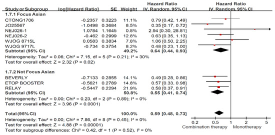 Among ever smoker, combination therapy prolonged PFS significantly regardless of ethnicity in Figure 6 (HR: 0.59, 95% CI: 0.48–0.73). Asian RCTs (HR: 0.64, 95% CI: 0.44–0.93) demonstrated less PFS benefit than global and non-Asian RCTs (HR: 0.55, 95% CI: 0.41–0.74). In terms of never smoker (Figure 7), no superior effects were presented for patients received combination therapy among Asian RCTs (HR: 0.92, 95% CI: 0.56–1.51) and global and non-Asian RCTs (HR: 0.90, 95% CI: 0.61–1.34).