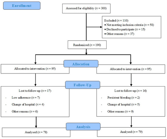 A total of 300 women (from 26 September 2020 to 30 June 2021) were assessed for eligibility, and 110 were not included: Among them, 58 did not meet the inclusion criteria, 15 declined to participate, and 37 for other reasons. Participants were divided into IG (n = 95) and CG (n = 95). In the IG, 20 women were lost to follow-up, 8 had low adherence, 5 changed hospitals, and 7 for other reasons. In the CG, 16 women were lost to follow-up: 2 had persistent bleeding, 5 changed hospitals, and 9 for other reasons (6 of them for not being within the parameters of the decision algorithm). Therefore, 75 individuals in the IG and 79 in the CG were analyzed (Figure 1). Finally, for the analysis of gestational weight gain, data from 68 women in the IG and 72 in the CG were used, as the data were not registered according to the protocol in the hospital.