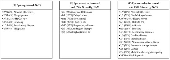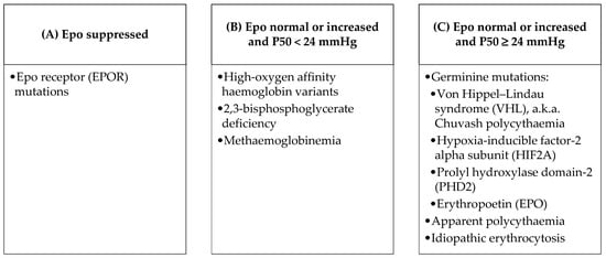 For the interpretation of results, we applied diagnostic algorithms proposed by others [,] to our cohort, comprising of sequential testing of Epo and P50 to evaluate for potential congenital causes of JAK2 unmutated polycythaemia. We observed a variety of different entities intermingled in the different combinations (Figure 4). Testing for Epo and P50 did not allow a clear triage for identification of congenital causes.