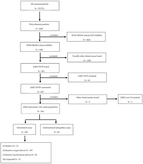 Therefore, in this retrospective cohort study, we aimed to investigate the clinical and laboratory data of underlying causes, as well as the real-world management and outcomes, of patients with JAK2 unmutated polycythaemia at a Swiss tertiary reference centre.