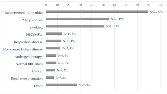 In 205 of 294 patients with JAK2 unmutated polycythaemia (70% of our study cohort), an underlying physiopathological mechanism to explain polycythaemia was found. Among those, 14 (5%) patients were diagnosed with relative (spurious), 139 (47%) with reactive oxygen-driven, 40 (14%) with reactive Epo- or hormone-driven and 12 (4%) with congenital polycythaemia. In 89 (30%) patients, the cause was idiopathic. Causes were subclassified, as presented in Table 1 and Table 2 and Figure 3.