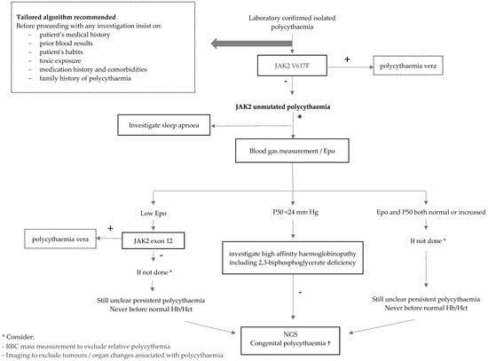 Our proposed diagnostic algorithm of JAK2 unmuted polycythaemia in adults. † Our 13-gene NGS panel includes: EPOR (exons 7,8), VHL (orf including exon 1’), EGLN1, EPAS1, EPO (including several regulatory regions), JAK2 (exons 9–16), BPGM, HBB, HBA1, HBA2, HIF3A, OS9, and SH2B3 (somatic).
