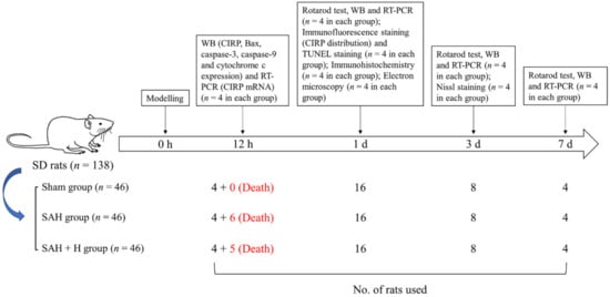 Rats were first numbered and then without the confounder control divided into three groups according to a random number table: (1) Sham-operation (Sham, n = 46); (2) SAH (n = 46); and (3) SAH + hypothermia (SAH + H, n = 46) (Figure 1). The principle of random assignment was still followed when sacrificing the rats and performing the histological examinations. The SAH + H group underwent surface cooling, using an ice bag immediately after the model was established, as previously described [23]. The rectal temperature was decreased to 30–31 °C within 30 min and maintained for 6 h by adjusting the distance of the ice bag from the animal. The rectal temperature in the other two groups was maintained at 36–37 °C. When the anesthetic effect wore off, rats in the Sham and SAH groups awoke after ~2 h and moved their limbs and heads. If there were signs of awakening during the 6 h of hypothermia treatment in the SAH + H group, 50% of the original dose of chloral hydrate was injected i.p. After 6 h of hypothermia treatment, animals were kept warm until awakening. No rat in the Sham group died, but five rats died in the SAH + H group during hypothermia treatment (10.8% mortality) and in the SAH group, six rats died (13% mortality). All dead rats were excluded from further analyses.