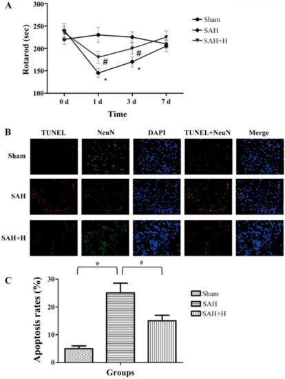 The rotarod and TUNEL staining. Rotarod test results (A) and TUNEL staining images (B) of the temporal cortexes for the indicated treatment groups (×400) 1 d after SAH induction. Panel (C) represents the apoptosis rates derived from the TUNEL assays. * p < 0.05 SAH vs. Sham, # p < 0.05 SAH vs. SAH + H.